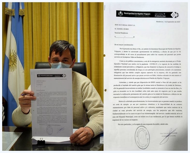 Pugnaloni expresa que “a raíz de la emergencia sanitaria decretada por el PEN con motivo de la pandemia COVID-19 y la vigencia de las medidas de ASPO, que han dispuesto la dispensa de concurrir al trabajo a aquellas personas consideradas de riesgo y/o con patologías preexistentes, sumado a la cuarentena obligatoria que han debido cumplir algunos operarios de la empresa, ello ha generado una disminución del personal activo que presta servicios en EDEN, viéndose afectado de esta manera el mantenimiento del servicio de energía eléctrica en el Partido de Hipólito Yrigoyen”.