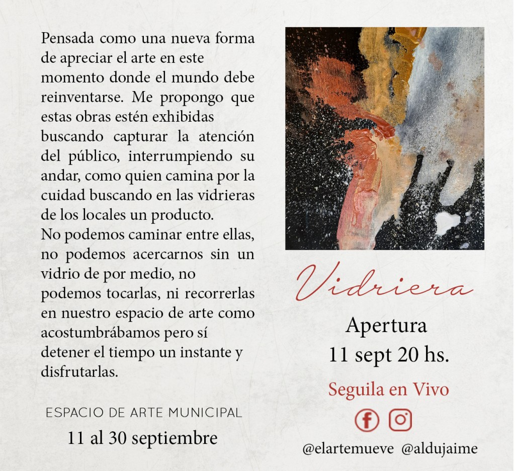 La inauguración de la muestras “Vidriera” será este viernes 11 de septiembre a las 20 horas con una transmisión en vivo a través de las redes sociales Facebook e Instagram de la Subsecretaría de Arte y de Aldana Jaime. En el streaming la Subsecretaria de Arte Vanina González entrevistará a la artista sobre su trayectoria en el arte visual, su formación académica, la identidad de su arte y el concepto que decidió desarrollar en la exposición.