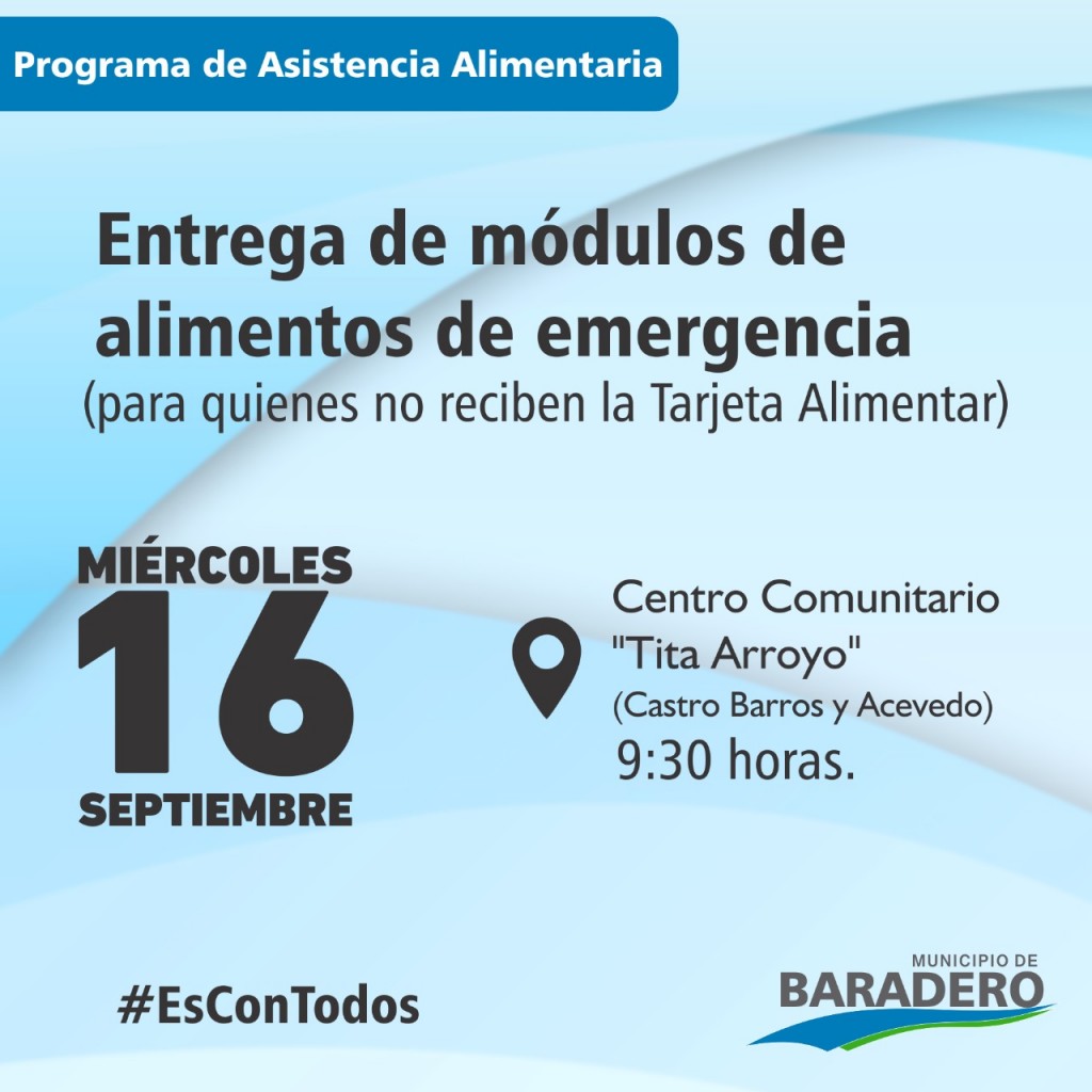 El Municipio de Baradero, a través de la Secretaría de Desarrollo Humano, informa que en el marco del Programa de Asistencia Alimentaria en contexto de emergencia sanitaria estará realizando la entrega de módulos de alimentos el miércoles 16 de septiembre a las 9:30 horas en el Centro Comunitario “Tita Arroyo” (Castro Barros y Acevedo)