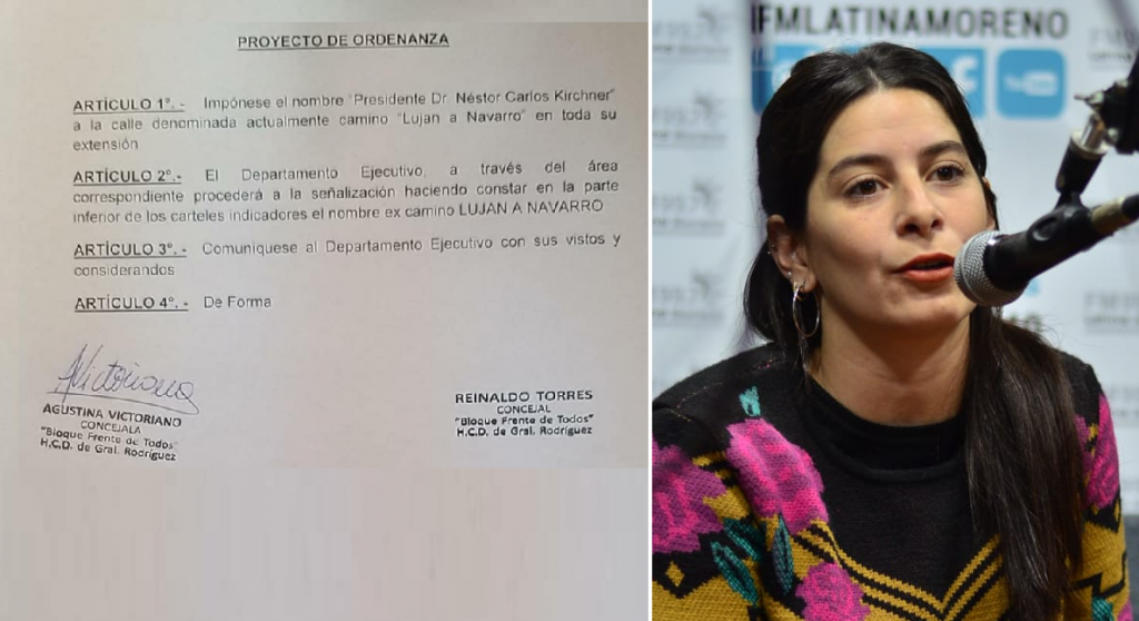 En la última semana los concejales Reinaldo Torres y Agustina Victoriano, integrantes del bloque Frente de Todos presentaron ante el cuerpo legislativo el proyecto para denominar la calle conocida como Camino a Navarro como “Dr. Néstor Carlos Kirchner”. La iniciativa está fundamentada en homenajear al ex presidente a diez años de su desaparición física
