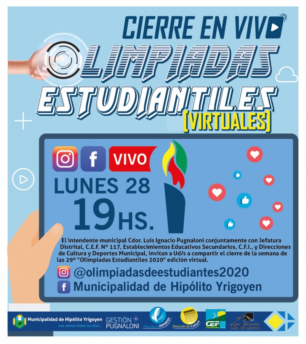 El intendente municipal Cdor. Luis Ignacio Pugnaloni conjuntamente con, Jefatura Distrital, C.E.F. Nº 117, Establecimientos Educativos Secundarios, C.F.I. y las Direcciones de Cultura y Deportes Municipal, invitan a Ud. /s a compartir el cierre de las 29º "Olimpiadas Estudiantiles 2020" edición virtual
