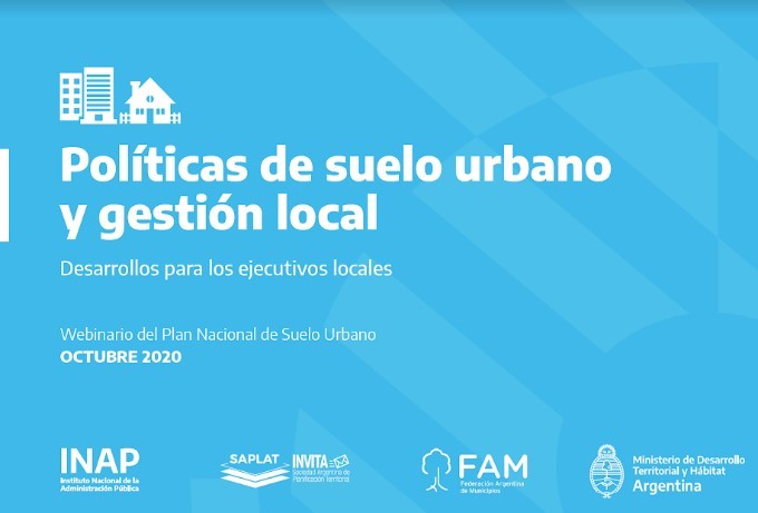 En el día de la fecha se dio inicio a un nuevo ciclo de encuentros virtuales Políticas de suelo urbano y gestión local: Desarrollo para los ejecutivos locales, un webinario del Plan Nacional de Suelo Urbano diseñado por el Ministerio de Desarrollo Territorial y Hábitat, en colaboración con la Federación Argentina de Municipios y Sociedad Argentina de Planificación Territorial