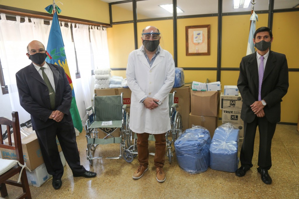 (San Pedro, 01.Oct.2020 / A1 Noticias) La donación consta de 2 sillas de ruedas para adultos, 4 mil guantes de látex, 200 barbijos quirúrgicos, 100 barbijos KN95, 200 batas quirúrgicas, 100 protectores faciales de plástico y 400 cubre calzados.