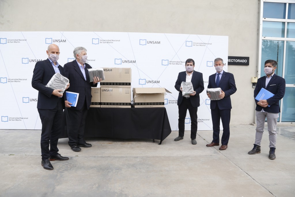 El intendente de San Martín, Fernando Moreira, junto al Secretario Nacional PyME, Guillermo Merediz, y el rector de la Universidad Nacional de San Martín, Carlos Greco, participó de la entrega de las mascarillas con triple protección Atom-Protect desarrolladas por la UNSAM y la UBA