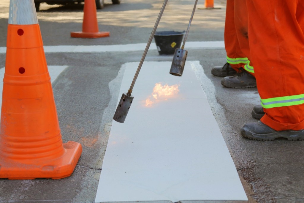 Tal es así que hoy a la mañana, en la intersección de Av. De Mayo y Bv. Rocha, cuadrillas conformadas por diferentes cooperativas integradas por mujeres estuvieron trabajando en la aplicación de termoplástico preformado.