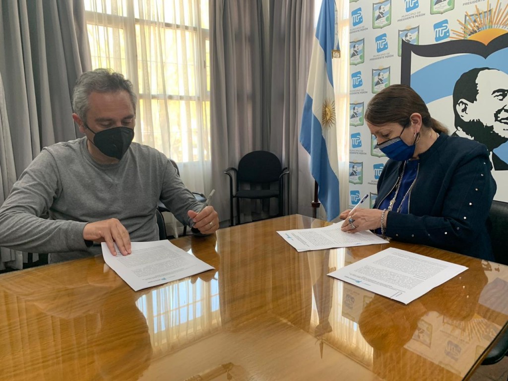 La rúbrica del convenio se realizó en la Sala de Situaciones de la Municipalidad, donde participaron además el subsecretario de Hábitat del Ministerio de Desarrollo de la Comunidad, Rubén Pascolini; y los secretarios del Gabinete municipal de Presidente Perón.