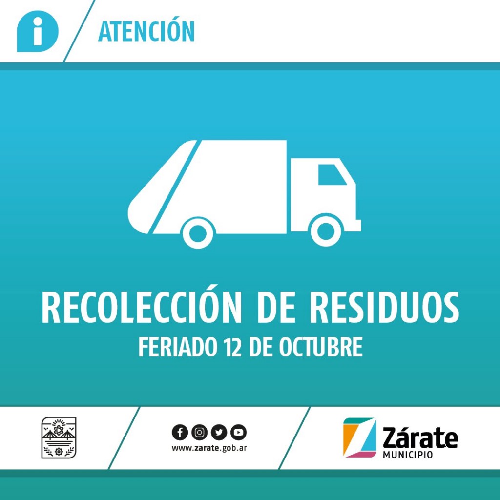 El Municipio de Zárate informa que, debido al feriado del día lunes 12 de octubre de 2020, habrá cambios en la frecuencia de recolección de residuos sólidos urbanos, que realiza la Empresa ENTRE, en la ciudad de Zárate