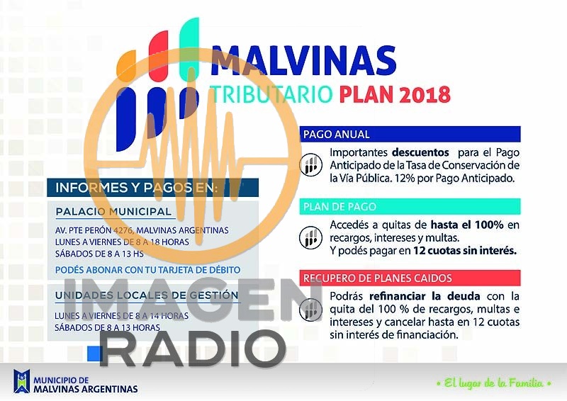 (Malvinas Argentinas, 15.Ene.2017 / A1 Noticias) El plan tributario 2018, brinda grandes facilidades para los vecinos de la comuna, quienes tendrán la posibilidad de acceder al pago anual con una reducción de los valores originales. También hay plan de recupero de deudores. Para cualquiera de los casos, tienen tiempo hasta el 31 de enero.