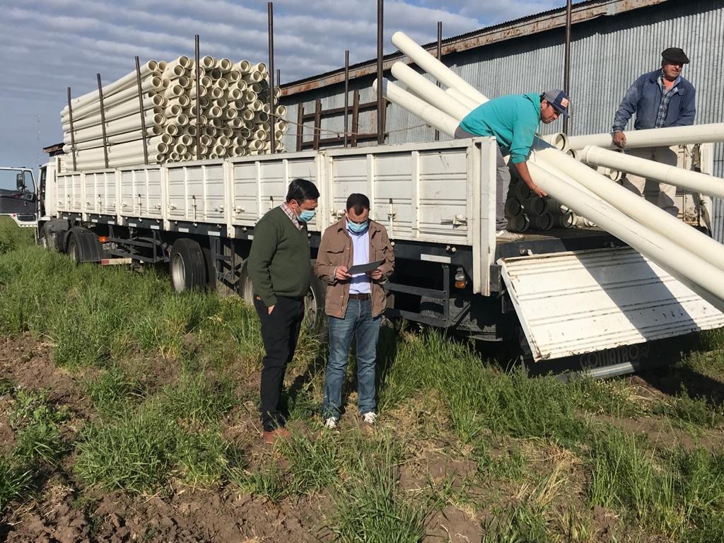 (H. Yrigoyen, 06.Nov.2020 / A1 Noticias) El jefe comunal acompañado del Jefe de Compras Santiago Pizarro y personal municipal de la Dirección de Obras Públicas, en la recepción de esta primera partida de caños para la vital obra.