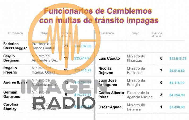 Veinte funcionarios de Macri registran importantes deudas por infracciones de tránsito, encabezando el listado el presidente del Banco Central, Federico Sturzenegger; y lo siguen los ministros Bergman y Frigerio. Las contravenciones multadas incluyen exceso de velocidad, mal estacionamiento y el uso del celular. Caso aparte es el titular de Seguridad Vial, quien fue multado por no respetar la senda peatonal