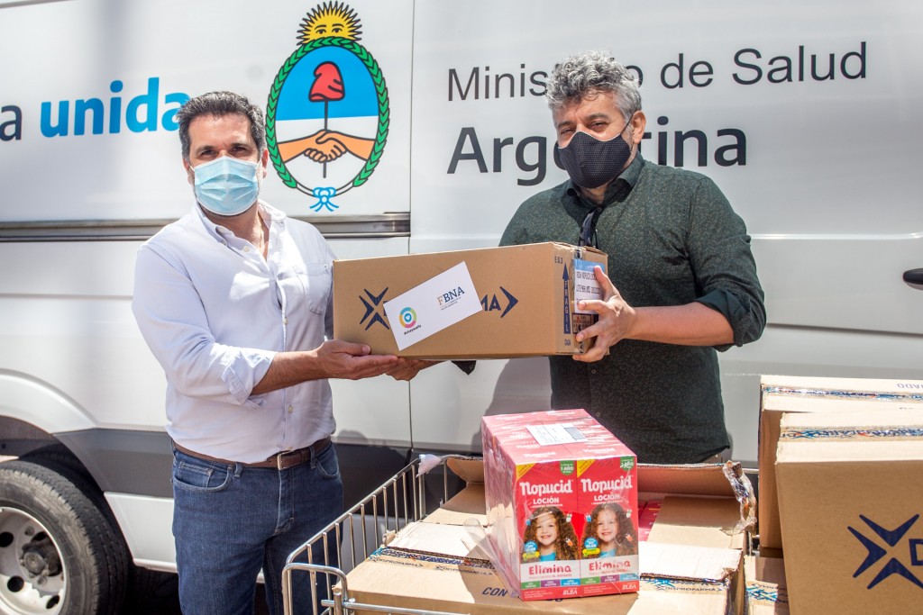 (Berazategui, 17.Nov.2020 / A1 Noticias) En un acto encabezado por el titular de la Cartera de Salud berazateguense, Dr. Pablo Costa, que se desarrolló en el playón del Edificio municipal, la Fundación Banco Nación hizo entrega de 600 tapabocas, 600 barbijos quirúrgicos y 570 lociones para combatir la pediculosis, que serán distribuidos en diferentes Centros de Salud del Municipio, en el contexto de emergencia sanitaria por coronavirus (COVID-19).