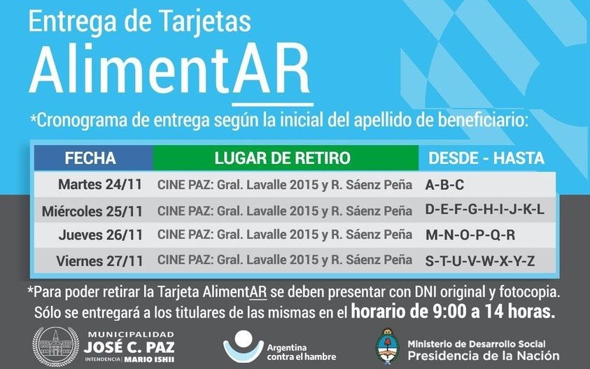 Desde el 24 y hasta el 27 de noviembre se realiza una nueva entrega de Tarjetas AlimentAR en el distrito que conduce Mario Ishii. Las mismas se llevarás a cabo en las instalaciones del ex Cine Paz ubicado en la intersección de las calles Lavalle y Roque Sanz Peña de 9 a 14 horas