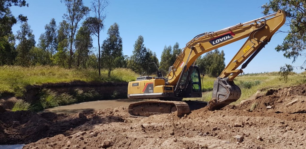 (Lobería, 01.Dic.2020 / A1 Noticias) El trabajo que se está ejecutando es el desvío del cauce del arroyo para poder sacar el agua del sector donde se va a realizar la fundación del puente sumergible.