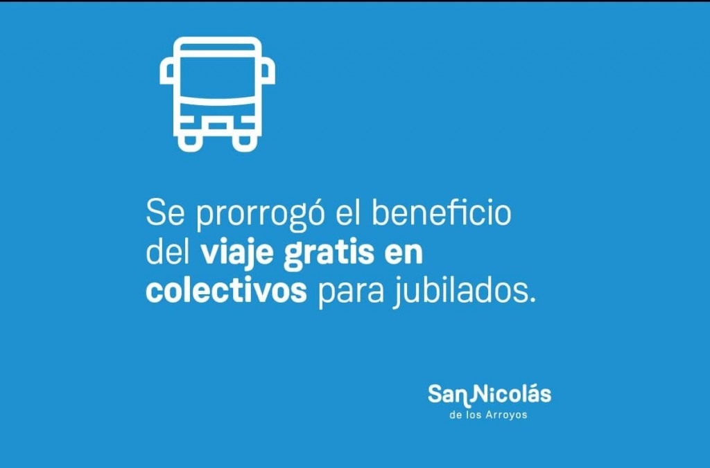 La Municipalidad de San Nicolás informa que, debido a la pandemia de COVID-19 y a fin de evitar aglomeramiento de vecinos en oficinas municipales, los jubilados nicoleños que cobran el salario mínimo y que ya cuentan con el carnet correspondiente con vencimiento en 2020, podrán seguir viajando en colectivo de manera gratuita los días sábados, domingos y lunes, ya que se prorrogó el vencimiento del beneficio por 6 meses, hasta el 30 de junio de 2021