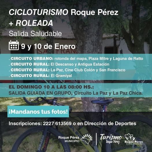 La Municipalidad de Roque Pérez a través de la Dirección de Deportes y Dirección de Turismo te invita a participar de una nueva Edición de Cicloturismo RP los días 9 y 10 de Enero con nueva propuesta roleada