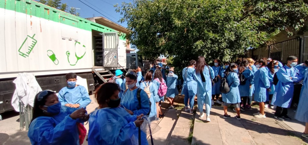 En la esquina de Remedios de Escalada y Godoy Cruz se instalaron carpas sanitarias, un móvil sanitario y una ambulancia para los casos sospechosos que se presentaran durante el “rastrillaje” sanitario efectuado por los promotores comunitarios.