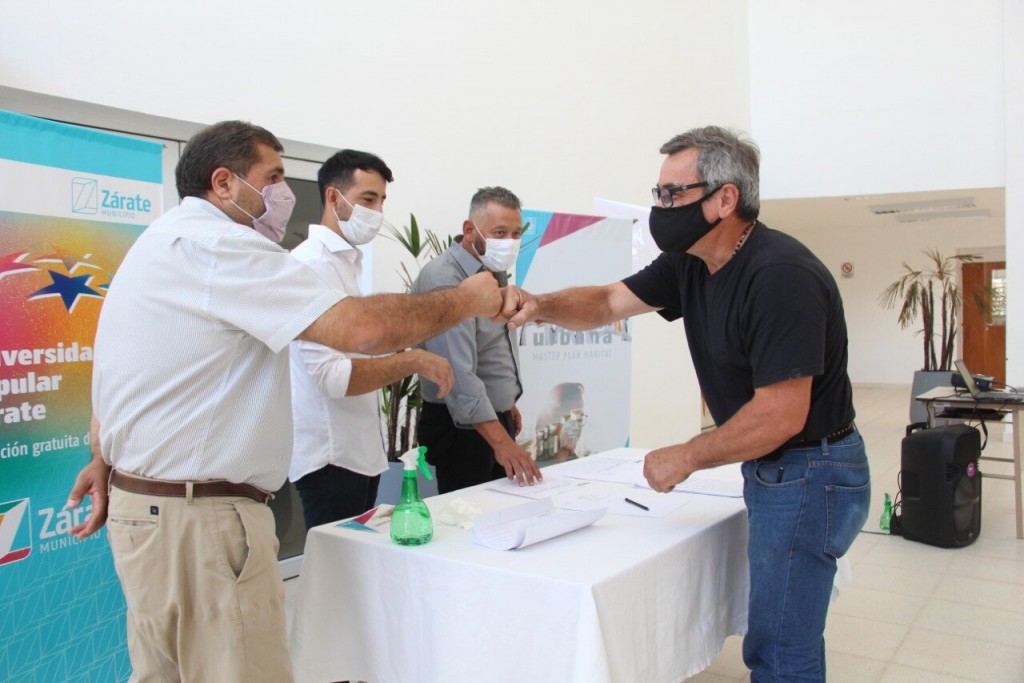 En las instalaciones de la Universidad Popular de Zárate (UPZ), en la mañana de hoy, el Municipio y seis instituciones firmaron el acta compromiso para sumarse al Programa Solidaridad Urbana Master Plan del Hábitat, un esquema lanzado a fin de 2020, por el intendente Osvaldo Cáffaro, que aspira a la resolución y gestión del hábitat