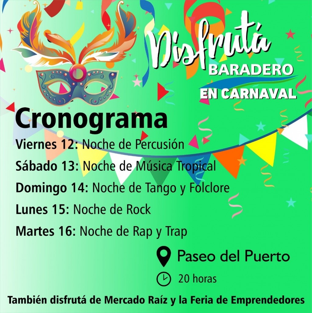 Llega una nueva propuesta turística a Baradero en el marco del fin de semana largo de Carnaval: “Disfrutá Baradero en Carnaval”. Este evento se desarrollará durante cinco noches en el Paseo del Puerto (Av. Almirante Brown s/n) buscando fortalecer el turismo y apoyar a los emprendedores, productores, artesanos y artistas baraderenses