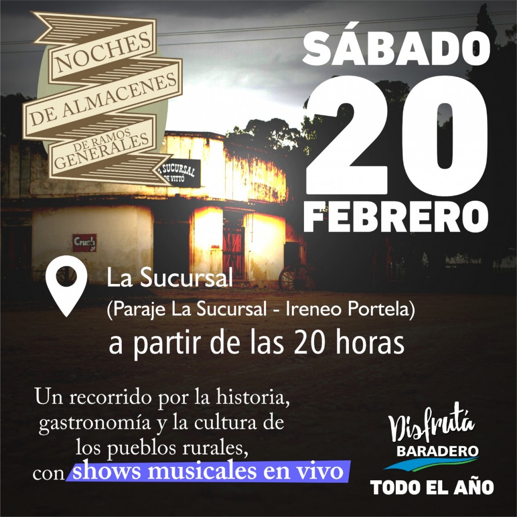 El sábado 20 de febrero a las 20 horas el almacén "La Sucursal" vuelve a ser el escenario de una noche en la cual podremos disfrutar música de artistas de la ciudad y de la gastronomía típica. La propuesta busca conectarnos con las raíces de los pueblos rurales, disfrutando de su cultura y sus tradiciones. Para participar de la jornada será necesario realizar reserva previa comunicándose al celular: 3329-15-693541.
