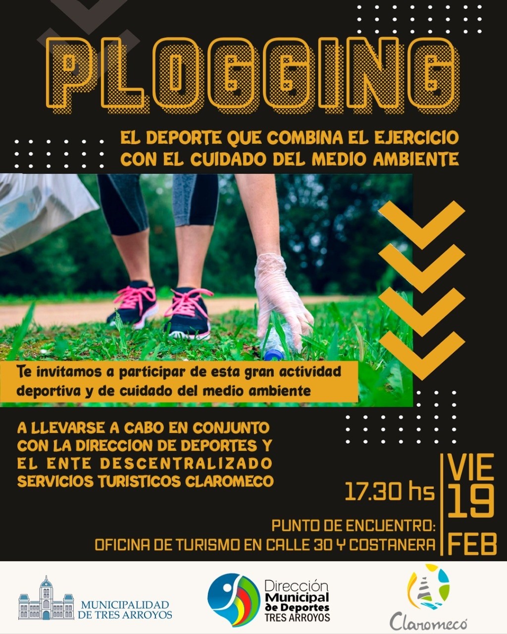La Municipalidad de Tres Arroyos, a través de la Dirección de Deportes informa que en conjunto con el Ente Descentralizado Servicios Turístico Claromeco realizarán el viernes 19 de febrero una combinación de ejercicios físicos con el cuidado del medio ambiente, tradicionalmente conocido como Plogging