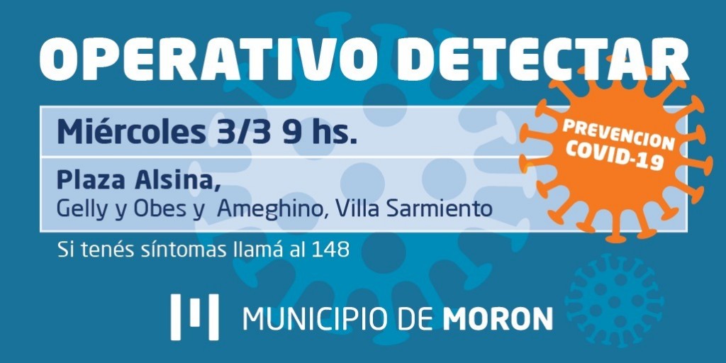(Morón, 02.Mar.2021 / A1 Noticias)El Municipio de Morón continúa llevando adelante operativos de detección temprana de Coronavirus en distintos puntos del partido. En esta oportunidad, se desplegarán este miércoles 3 en la plaza Alsina de Villa Sarmiento, ubicada entre las calles Gellys; Obes y Ameghino y el viernes 5, en la plaza Monumento a la Bandera de en Morón sur, entre las calles Azul y Mburucuyá.