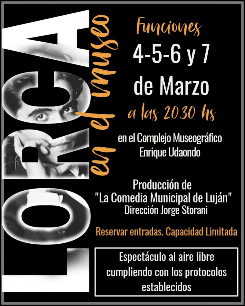 El Municipio de Luján invita a la comunidad a las funciones de “Lorca en el Museo”, una producción del grupo de comedia Municipal, que se llevarán a cabo esta semana bajo el cumplimiento de estrictas medidas sanitarias