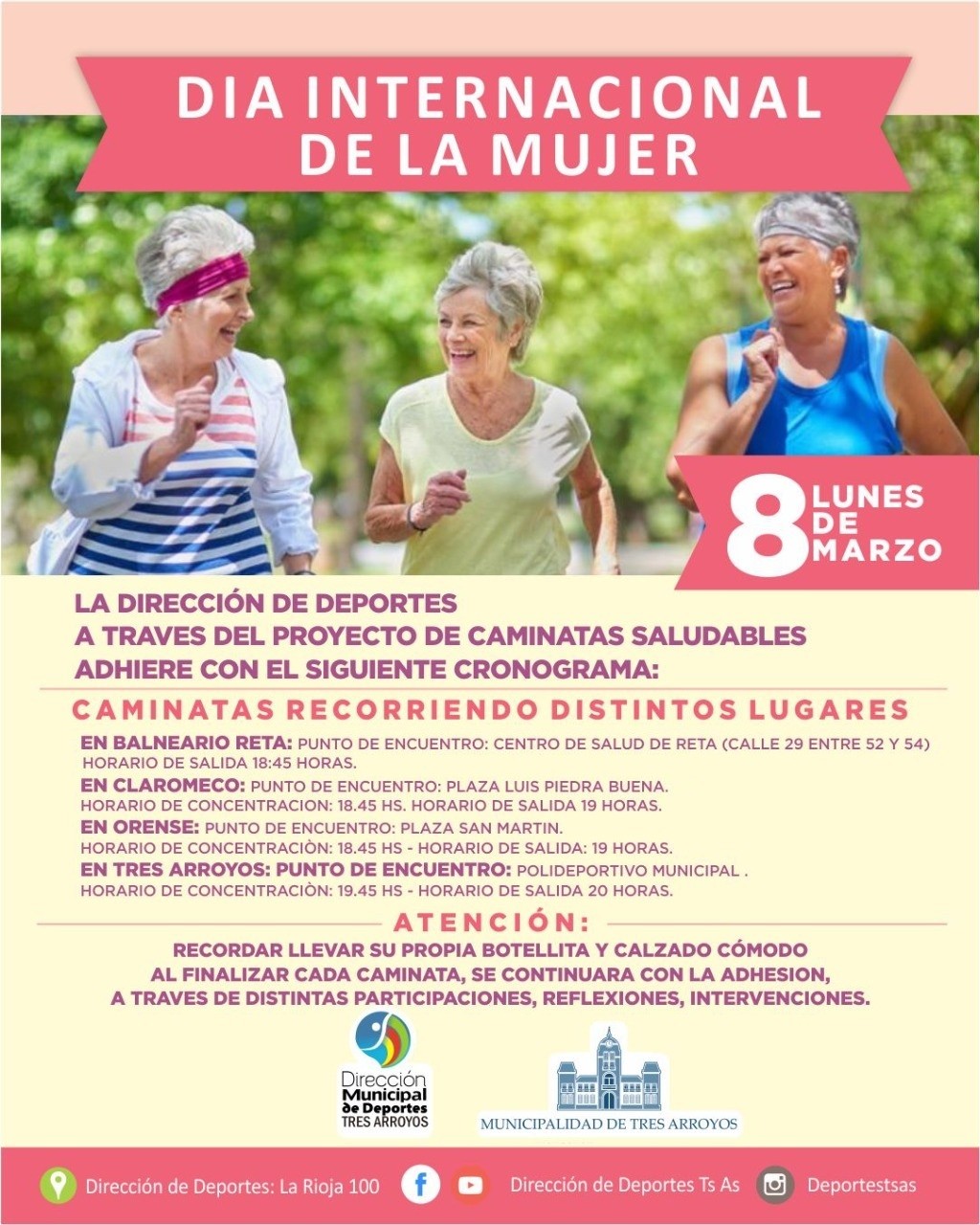 La Municipalidad de Tres Arroyos a través de la Dirección de Deportes dentro de su programa de "Caminatas Saludables" realizarán en el mismo momento en Tres Arroyos, Orense, Claromecó y Reta una jornada de Caminata Saludable y actividades referidas al Día Internacional de la Mujer a realizarse el día lunes 08 de marzo a partir de las 18.30 horas (Claromecó, Reta y Orense) y a partir de las 20 horas en Tres Arroyos