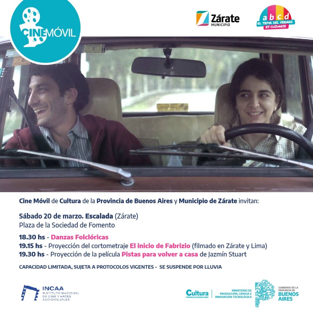 Este sábado 20 de marzo, desde las 18:30 horas, dará inicio la actividad con un numero de danzas Folclóricas, luego, a las 19:15, se realizará la proyección del cortometraje regional “El inicio de Fabricio” (filmado en Zárate y Lima), y de la película “Pistas para volver a casa” de Jazmín Stuart.