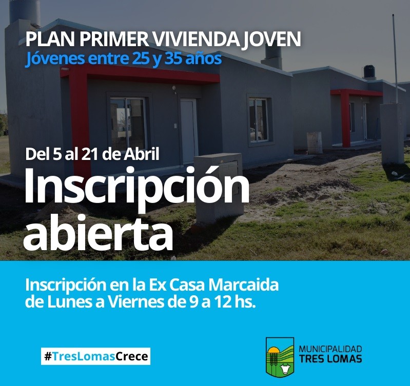 La Municipalidad de Tres Lomas informa, que desde este lunes 5 de abril se encuentra abierta la inscripción de aspirantes para la adjudicación de tres viviendas del plan denominado “Primer Vivienda Joven”, la cual permanecerá abierta hasta el día 21 de abril del corriente año