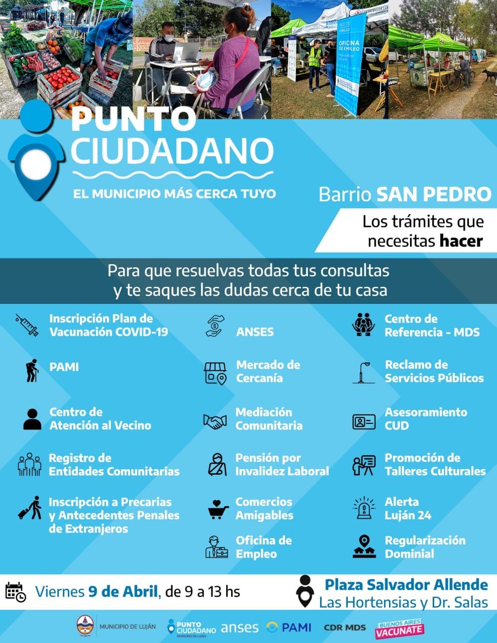 El programa Punto Ciudadano llegará este viernes 9 de abril al barrio San Pedro, con el objetivo de acercar a la comunidad los servicios del Municipio y de otros organismos provinciales y nacionales