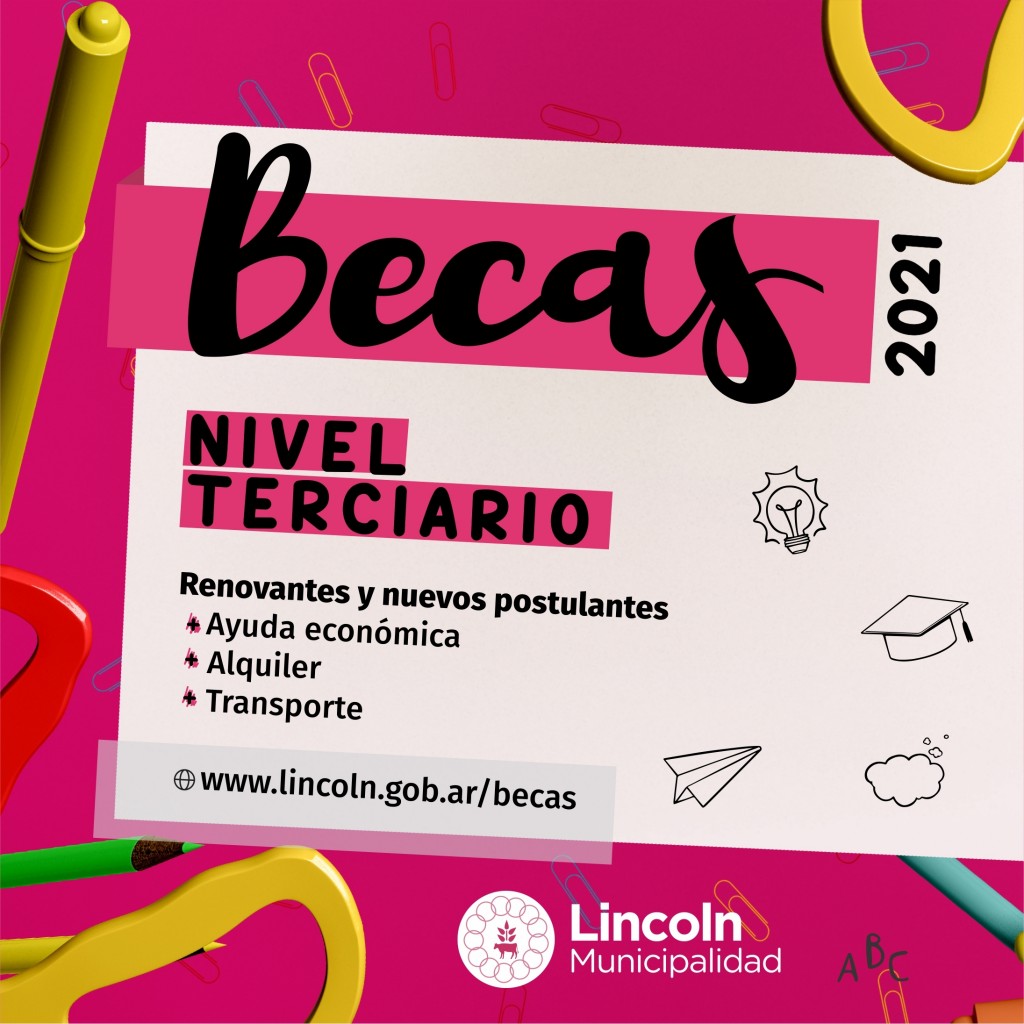 (Lincoln, 08.Abr.2021 / A1 Noticias)Con el objetivo de facilitar a los jóvenes del Distrito los medios para la continuación de estudios superiores no universitario y universitarios, la Municipalidad de Lincoln abrió una nueva convocatoria al “Programa de Becas”. El periodo de inscripción permanecerá abierto de forma online del 12 al 23 de abril, a través del enlace web: www.lincoln.gob.ar/becas