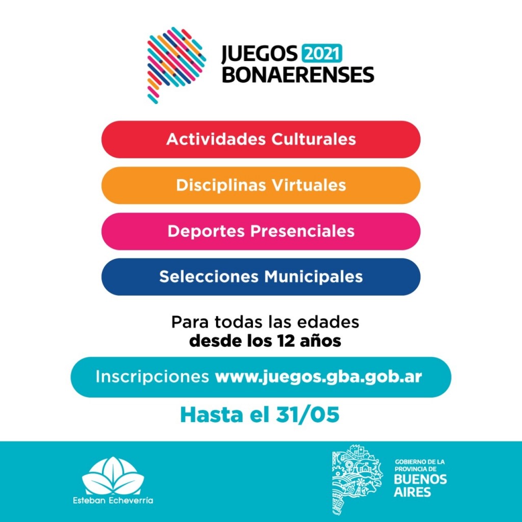 Las vecinas y vecinos de Esteban Echeverría mayores de 12 años, sin límite de edad, podrán inscribirse hasta el 31 de mayo en los Juegos Bonaerenses 2021. Este año, tendrán la posibilidad de formar parte de diversas actividades culturales, además de competir virtual y presencialmente en distintas disciplinas deportivas