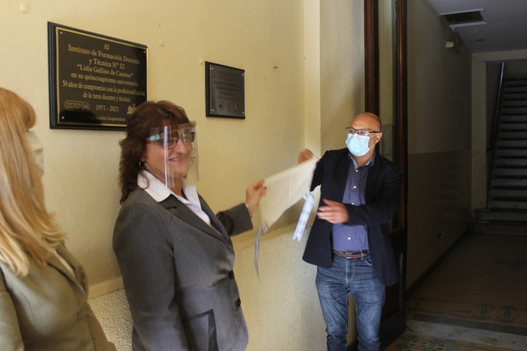 El intendente municipal, Esteban Reino, procedió esta mañana al descubrimiento de una placa en nombre del “Pueblo y Gobierno” el hall del Instituto Superior de Formación Docente y Técnico Nº 32 “Lidia Gallino de Camino” en el contexto del cincuentenario de su creación. La institución también hizo lo propio