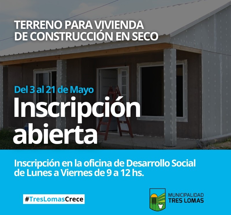 La Municipalidad de Tres Lomas informa que se encuentra abierta la inscripción para la adquisición de un terreno para viviendas de construcción en seco, correspondiente al lote de 10 parcelas que fueron destinadas para este tipo de construcción, de los cuales fueron adjudicados 9