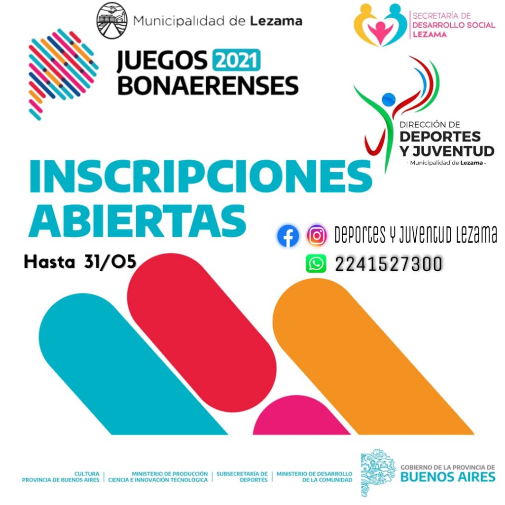 La Dirección de Deportes y Juventud, dependiente de la Secretaría de Desarrollo Social del municipio, informa que durante todo el mes de mayo se inscribirá a interesados en participar de la edición 2021 de los Juegos Bonaerenses, en disciplinas individuales y por equipo para todas las categorías