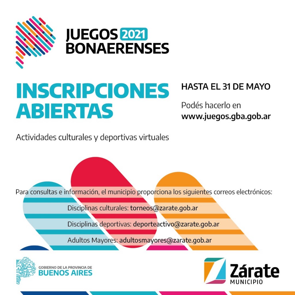 El municipio de Zárate, a través de la secretaria de Desarrollo Humano y Promoción Social, informa que se encuentra abierta la inscripción a los juegos bonaerenses, hasta el 31 de mayo