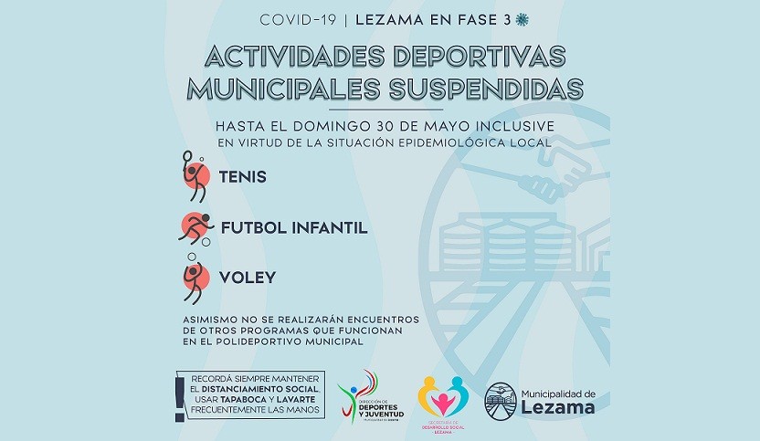 (Lezama, 19.May.2021 / A1 Noticias) Mediante una comunicación oficial, el gobierno local de Lezama suspendió las disciplinas deportivas que incluyen Tenis, Fútbol Infantil y Voley, debido al aumento de casos positivos de Covid-19.