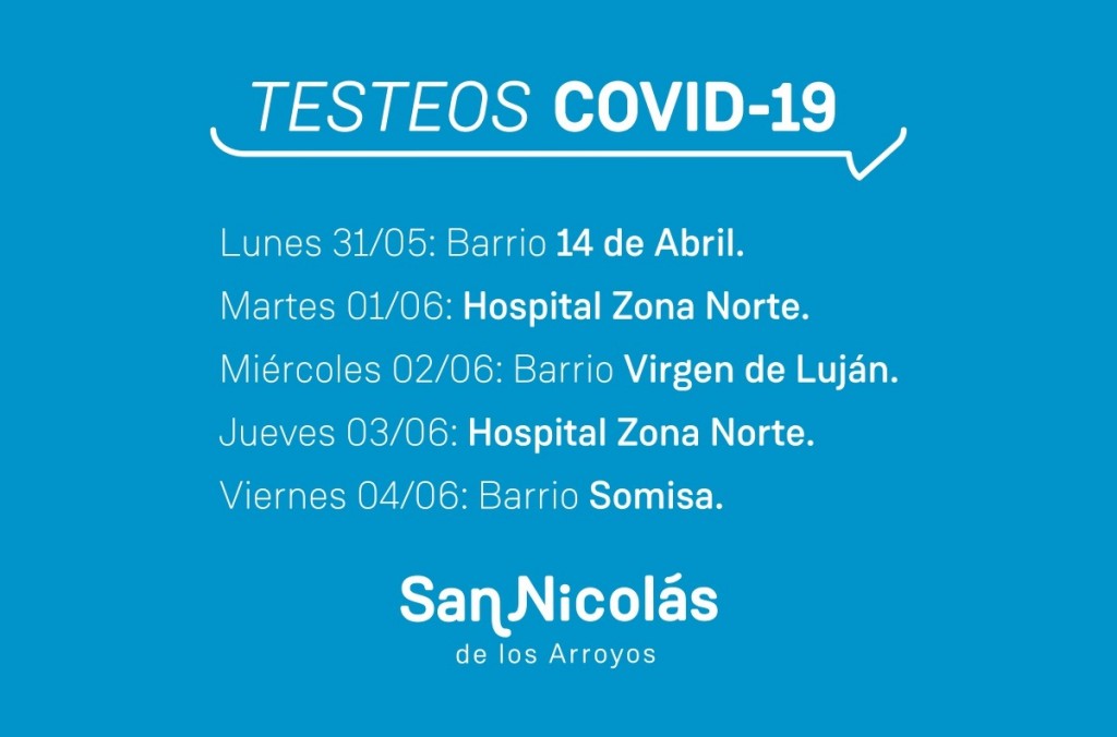 La Municipalidad de San Nicolás continuará esta semana realizando testeos gratuitos Covid-19 en distintas zonas de la ciudad, con el objetivo de identificar en forma temprana, casos presintomáticos y asintomáticos en contactos estrechos, como así también en pacientes sintomáticos para arribar al diagnóstico respectivo
