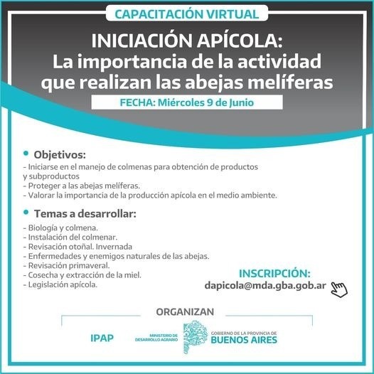 Desde el área de Producción y Empleo del municipio se extiende la invitación para participar de una capacitación virtual, a realizarse el próximo miércoles 9 de junio, sobre Iniciación Apícola: la importancia de la actividad que realizan las abejas melíferas, coordinado por el Ministerio de Desarrollo Agrario de la Provincia