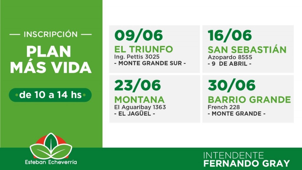 (Esteban Echeverría, 07.Jun.2021 / A1 Noticias) Las actividades tendrán lugar, de 10 a 14 hs, y se desarrollarán: el miércoles 9 de junio, en Ingeniero Pettis 3025, barrio El Triunfo, Monte Grande Sur; el miércoles 16, en Azopardo 8555, San Sebastián, 9 de Abril; el miércoles 23, en El Aguaribay 1363, barrio Montana, El Jagüel; y el miércoles 30, en French 228, Barrio Grande, en la localidad de Monte Grande.