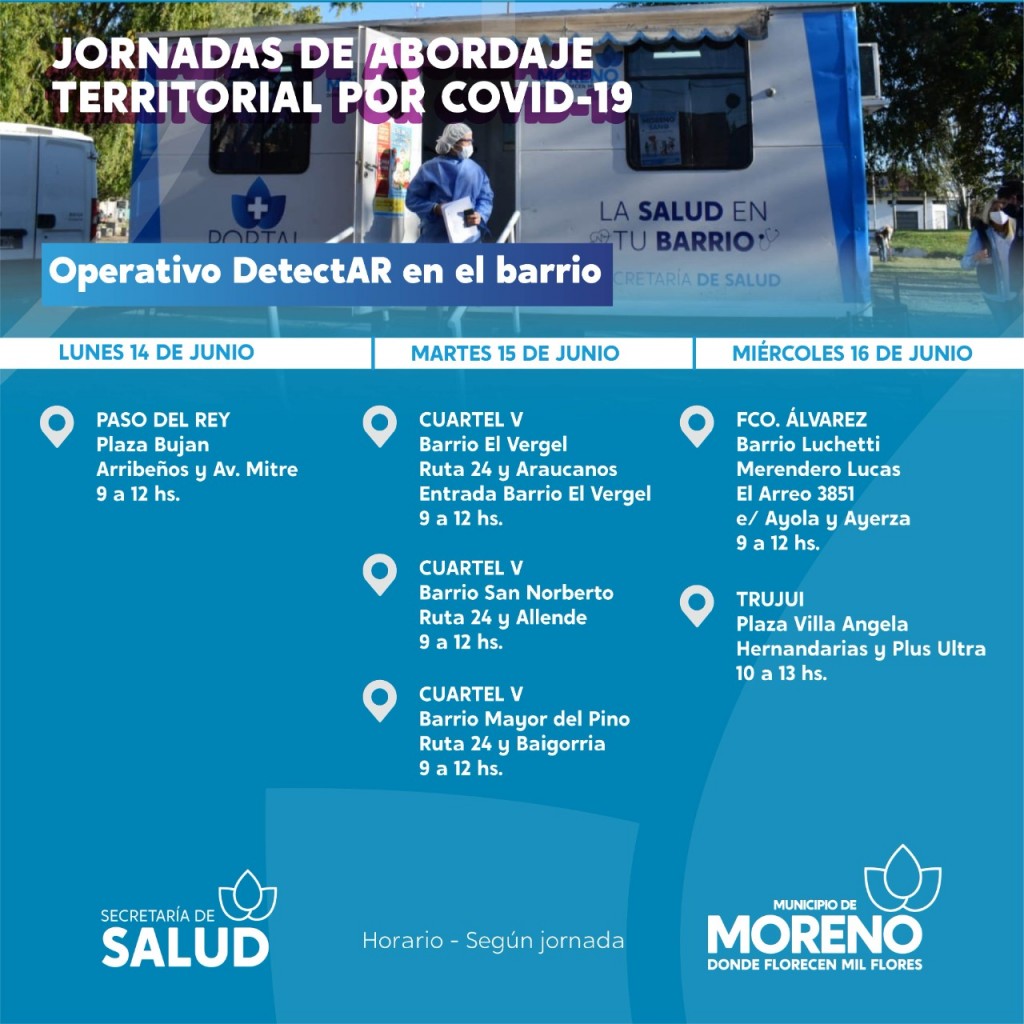 La Municipalidad de Moreno informa a toda la comunidad que continúan los Operativos DETECTAR. Los mismos se realizan todas las semanas en diferentes puntos del distrito -en modalidad itinerante- para que todas las vecinas y los vecinos puedan realizarse los testeos correspondientes al Covid-19