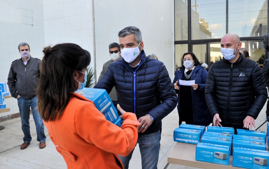 El intendente Juan Zabaleta y el vicerrector de la UNAHUR, Walter Wallach, entregaron los medidores de dióxido de carbono “Aire Nuevo” a todas las escuelas del partido, de modalidad pública y privada. Es un dispositivo tecnológico desarrollado por la Universidad Nacional de Hurlingham para medir la ventilación en los espacios cerrados con el objetivo de disminuir el riesgo de contagio de Covid-19
