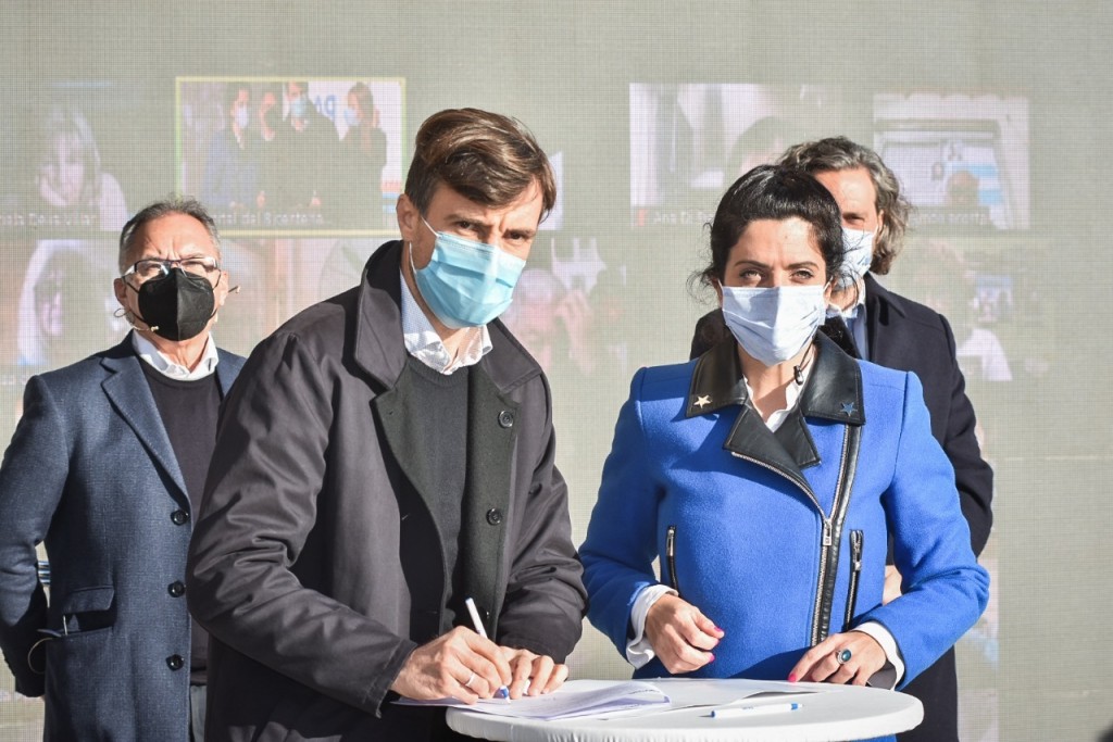 El intendente de Morón, Lucas Ghi, junto a la titular de PAMI, Luana Volnovich, firmaron un convenio que permitirá sumar los vacunatorios municipales a la campaña de vacunación antigripal para sus afiliados y afiliadas