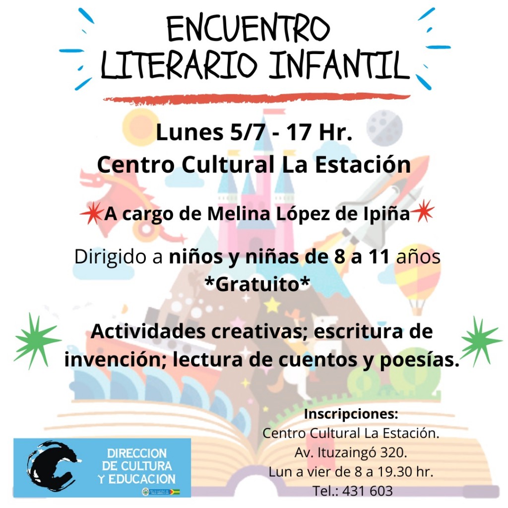 La Dirección de Cultura y Educación de la Municipalidad de Tres Arroyos invita a niños y niñas de entre 8 y 11 años a participar del Encuentro Literario Infantil a cargo de Melina López de Ipiña que se llevará a cabo el próximo lunes 05 de julio a las 17.00 en el Centro Cultural La Estación