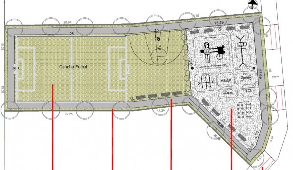Contará con una cancha de fútbol de 15 x 25 metros, con arcos y demarcación y, también tendrá un aro de básquet en un espacio de 15 metros cuadrados.