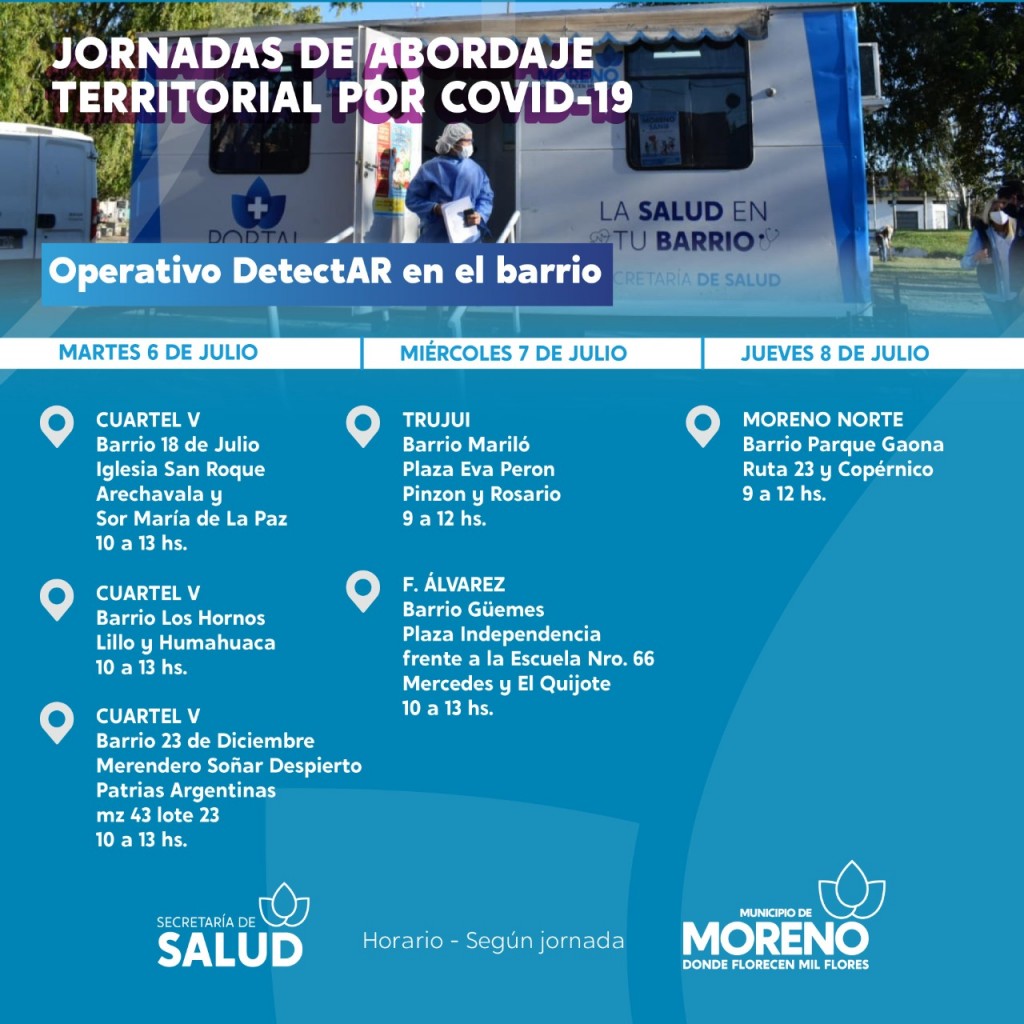 La Municipalidad de Moreno informa a toda la comunidad que continúan los Operativos DETECTAR. Los mismos se realizan todas las semanas en diferentes puntos del distrito -en modalidad itinerante- para que todas las vecinas y los vecinos puedan realizarse los testeos correspondientes al Covid-19