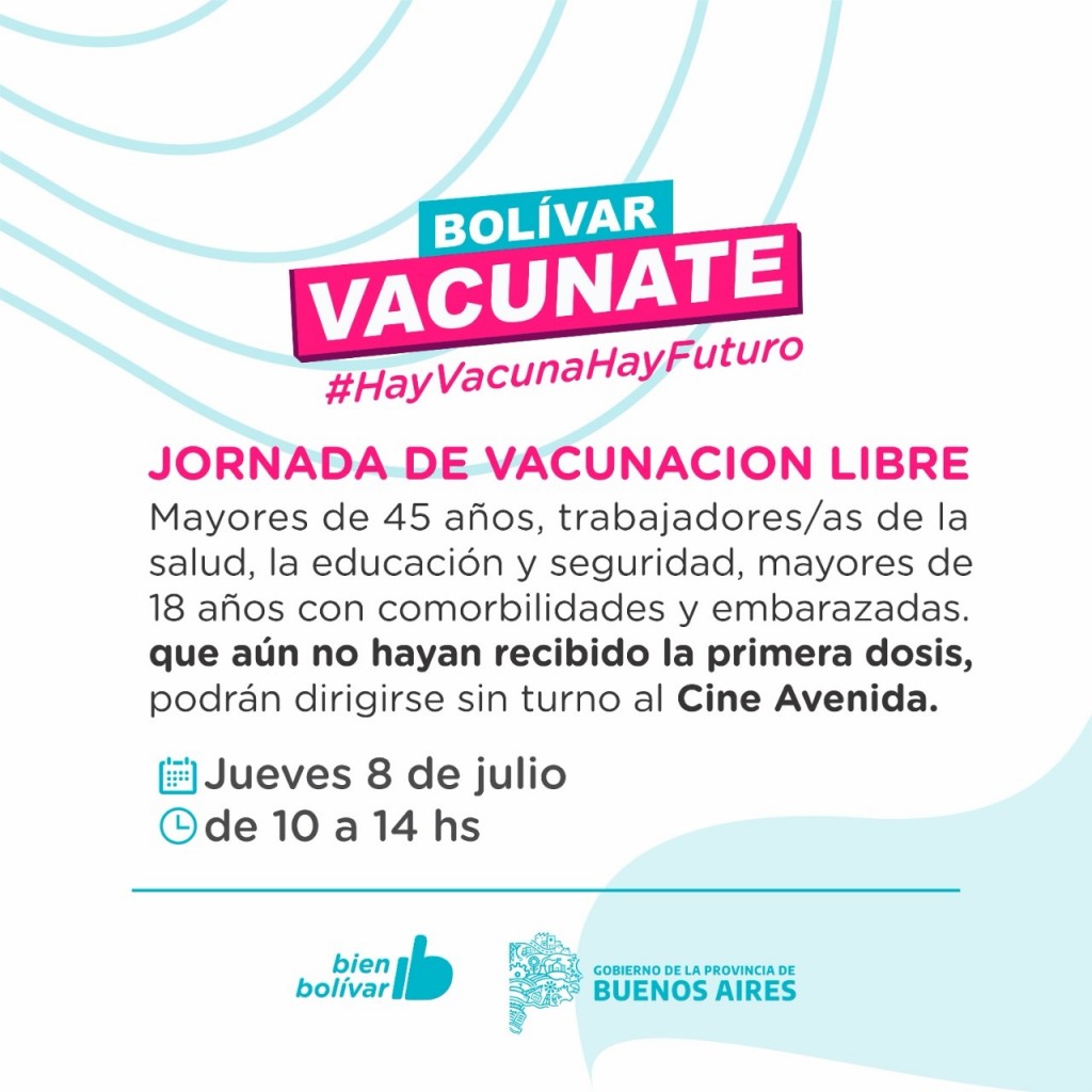 En esta oportunidad, Bolívar llevará adelante este miércoles 7 y jueves 8, de 10 a 14hs,  dos nuevas jornadas de vacunación libre a mayores de 45 años; mientras que los días viernes 9 y sábado 10, de 10 a 14hs, la posta de vacunación se habilita para mayores de 40 años en el Cine Avenida.