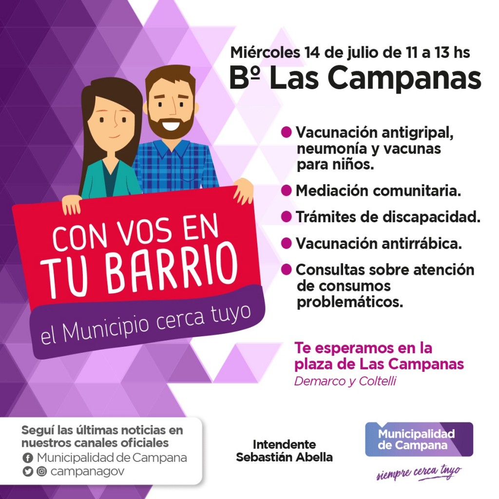 (Campana, 12.Jul.2021 / A1 Noticias)El programa municipal “Con vos en tu barrio” llegará este miércoles a Las Campanas para que los vecinos puedan realizar trámites y acceder a información en la cercanía de sus hogares.