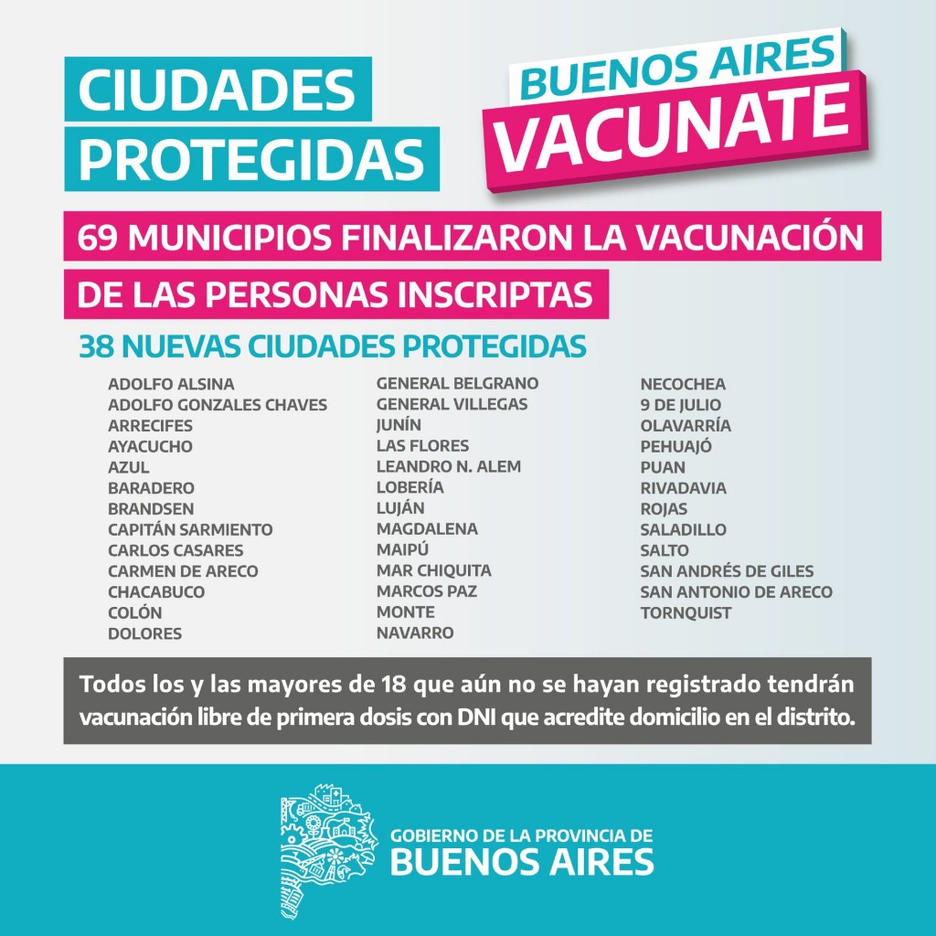 (Puan, 15.Jul.2021 / A1 Noticias)Así fue anunciado por el gobernador, Axel Kicillof, en conferencia de prensa el pasado martes. “Ciudades Protegidas” son aquellas en los vacunaron al 95% de los inscriptos y al 90% de la población total con al menos una dosis de la vacuna contra el Covid-19.