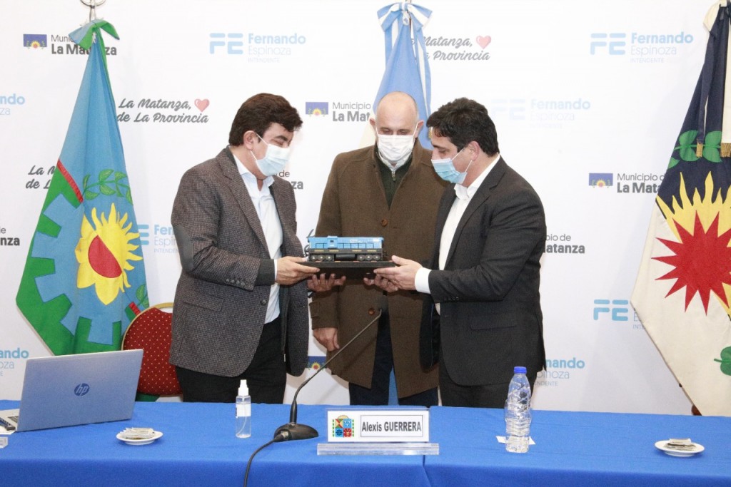 El intendente de La Matanza, Fernando Espinoza, junto al ministro de Transporte de la Nación, Alexis Guerrera, y el presidente de Trenes Argentinos Operaciones e Infraestructura, Martín Marinucci, firmaron un convenio para la construcción del paso bajo nivel en las vías del ferrocarril Roca y Avenida Arturo Illia, en San Justo